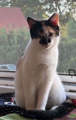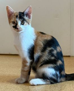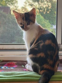 Finchen (w) tricolor rote Nase, kleines zartes Wesen. Sie ist mutig und sehr neugierig.